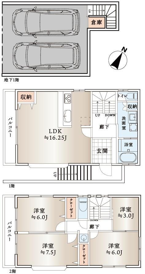 バルコニー・都市ガス・車庫・トイレ2ヶ所・上水道・本下水・駐車場2台分 |