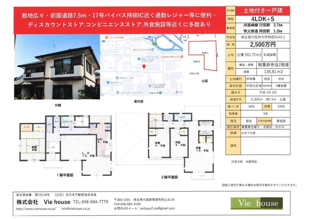<物件名>大字持田(行田駅) 2500万円/<駐車場>カースペース/<土地権利>所有権/<間取り>4LDK+S(納戸)/<特徴>駐車2台可・2沿線以上利用可・土地100坪以上・LDK18畳以上・南向き 販売戸数:1戸 |