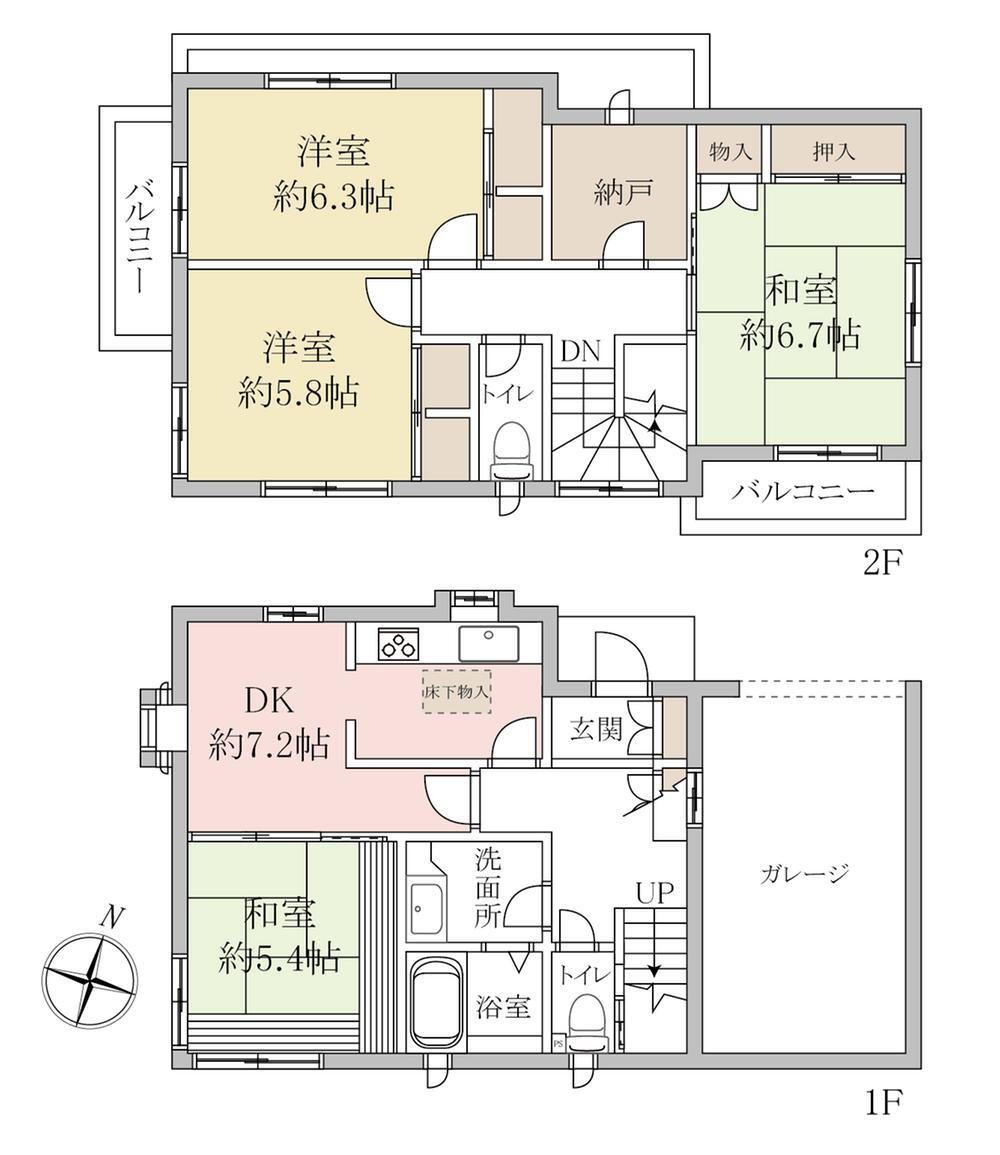 バルコニー・トイレ・収納スペース・都市ガス・温水洗浄便座・システムキッチン・モニタ付インターホン・風呂・トイレ2ヶ所・床下収納・2面バルコニー・上水道・本下水 |