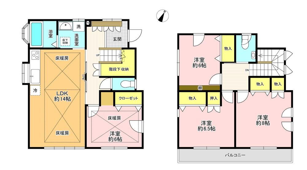 バルコニー・トイレ・収納スペース・都市ガス・浴室乾燥機・温水洗浄便座・システムキッチン・モニタ付インターホン・風呂・庭・トイレ2ヶ所・床下収納・床暖房・衣類乾燥機・複層ガラス・上水道・本下水・フローリング・省エネ給湯器・シューズインクローク |