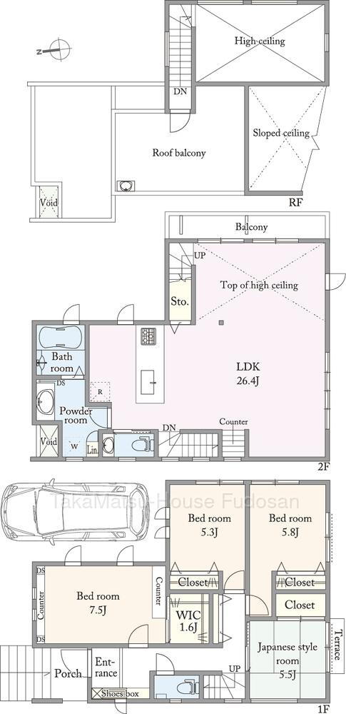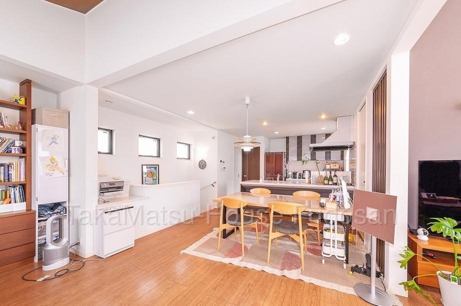 - ・LDKは約26帖の広さが有り、吹き抜けの部分は約3.5Mの天井高が有り、明るさと開放感をもたらしています。・2階のLDKに隣接して水回りを配置し、1階に居室4部屋を纏めていて生活動線の優れた間取りになっています。主寝室にはWIC(約1.6帖)とクローゼットが有り、各部屋、LDKにも収納を設置し収納力は高く、結果お部屋が広く使えます。・屋上階には約7.7帖の広いルーフバルコニーが有り、多目的に使用出来る嬉しいスペースです。