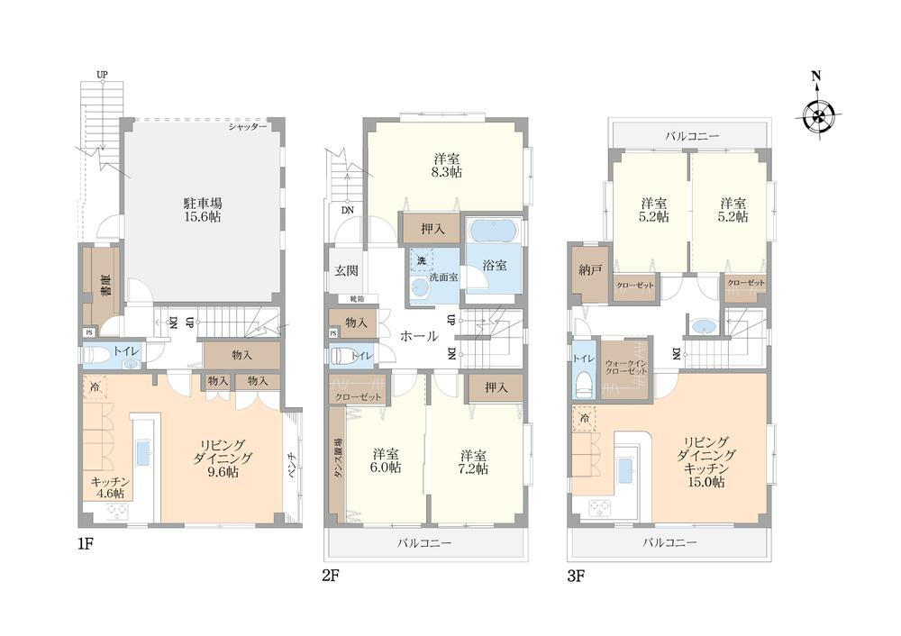 建物面積 192.99m2(58.37坪)(登記)、うち1階車庫25.38m2 建物構造・規模 鉄骨3階建