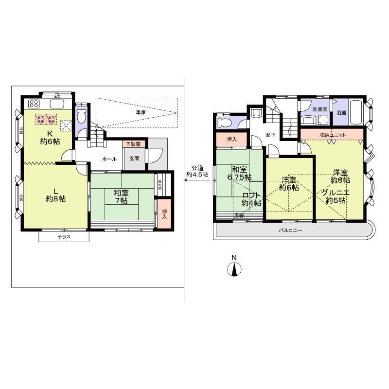 | 設備 | バルコニー・トイレ・収納スペース・都市ガス・温水洗浄便座・システムキッチン・風呂・庭・トイレ2ヶ所・床下収納・グルニエ・上水道・本下水・駐車場2台分 |