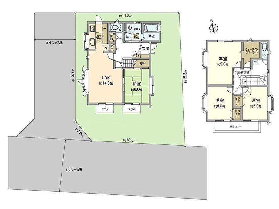 バルコニー・収納スペース・都市ガス・ウォークインクローゼット・風呂・テラス・庭・トイレ2ヶ所・床下収納・上水道・本下水 |