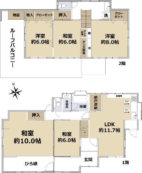 バルコニー・トイレ・収納スペース・浴室乾燥機・温水洗浄便座・風呂・トイレ2ヶ所・床下収納・ルーフバルコニー・床暖房・衣類乾燥機・食器洗浄乾燥機・都市ガス |