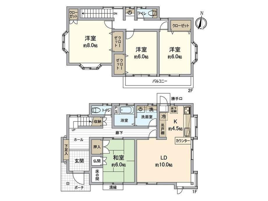 バルコニー・収納スペース・都市ガス・システムキッチン・風呂・庭・トイレ2ヶ所・床下収納・グルニエ・上水道・本下水 |