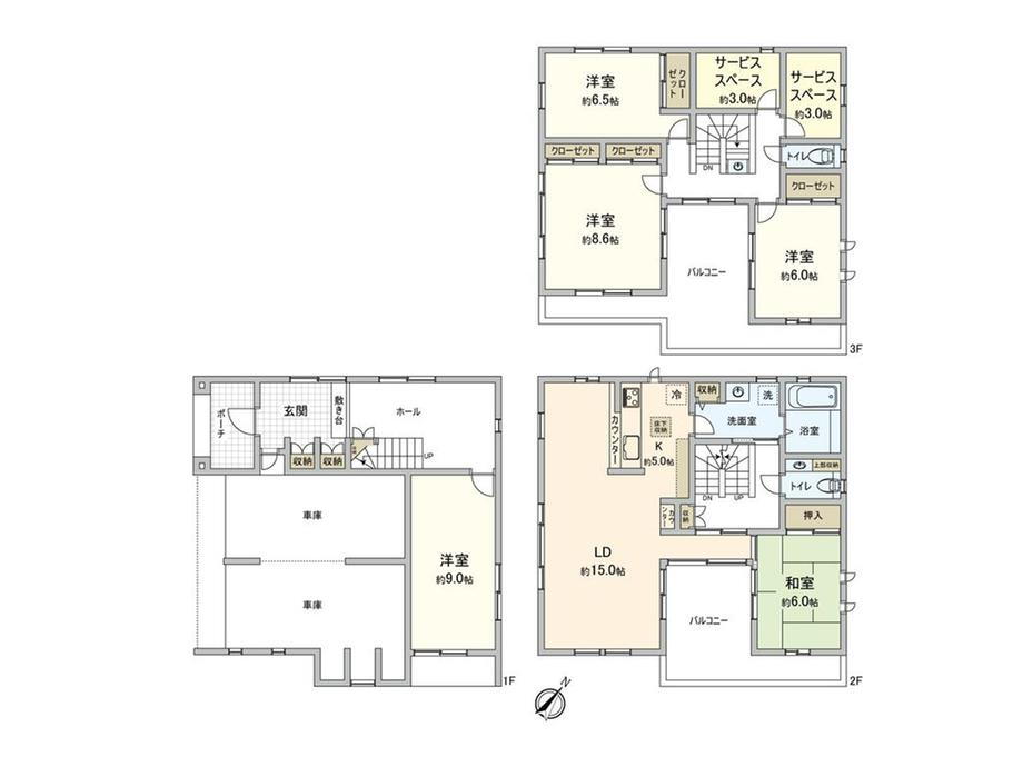 - ■おすすめポイント━━━━━・・・・・○JR相模線上溝駅より徒歩圏の一戸建○土地面積:126.68平米(約38.32坪)○建物面積:194.98平米(約58.98坪)○ 建ぺい率60% 容積率200%○南西約4.5m・南東約6.0m道路○南西・南東の角地のため陽当り良好○車庫3台分有り(車種による)○3階建の5LDKの間取○3階にサービススペース(納戸)3帖×2室有り○2階にある広々として明るい約20帖のLDK○2階・3階にバルコニー有り○2階・3階の全居室に収納有り○2階・3階にトイレ有り■ アクセス ━━━━━・・・・・〇JR相模線「上溝」徒歩21分