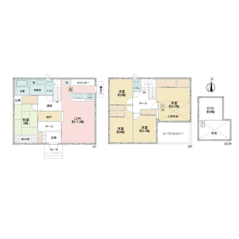 | 設備 | 収納スペース・浴室乾燥機・モニタ付インターホン・風呂・庭・対面K・トイレ2ヶ所・床下収納・IHクッキングヒータ・床暖房・衣類乾燥機・上水道・本下水・太陽光システム | ||||