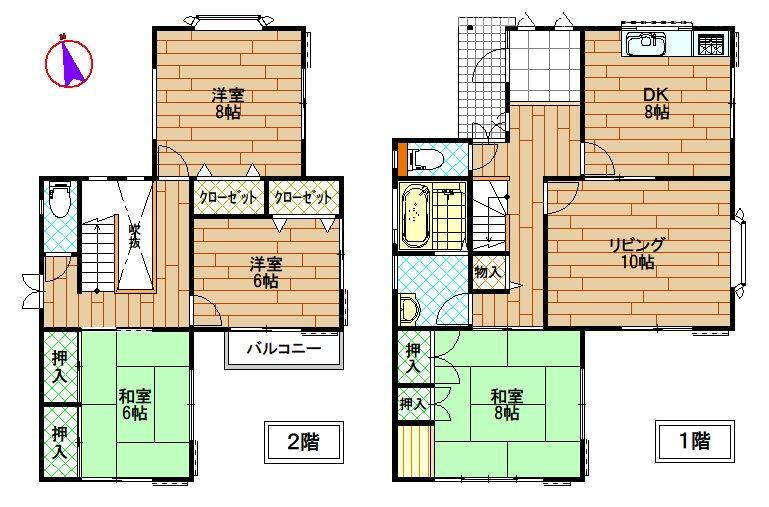 バルコニー・収納スペース・風呂・庭・トイレ2ヶ所・床下収納・上水道・本下水・駐車場2台分 |