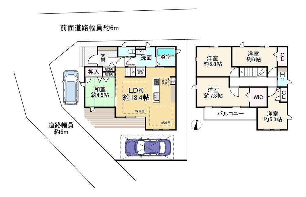 バルコニー・収納スペース・都市ガス・ウォークインクローゼット・対面K・トイレ2ヶ所・床下収納・床暖房・上水道・本下水・駐車場2台分 |