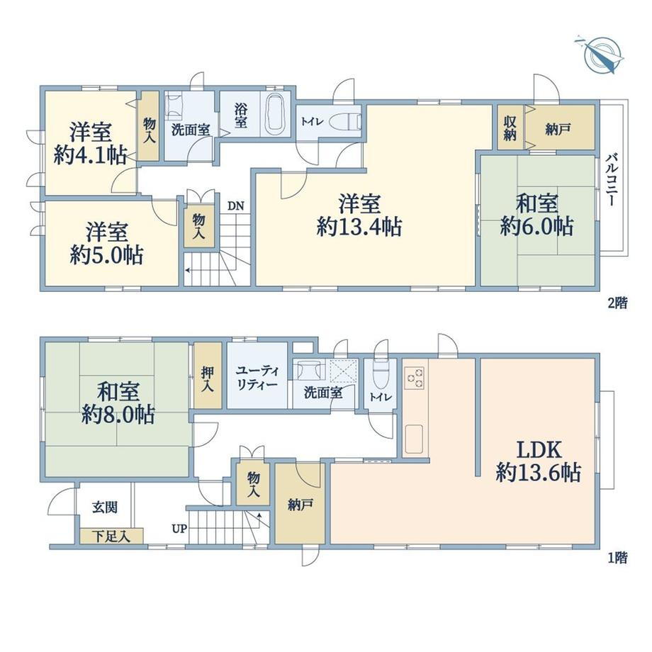 バルコニー・収納スペース・都市ガス・浴室乾燥機・システムキッチン・モニタ付インターホン・風呂・庭・トイレ2ヶ所・床下収納・浄水器・衣類乾燥機・食器洗浄乾燥機・上水道・本下水 |