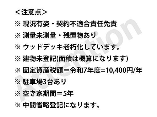 ※現況有姿・契約不適合責任免責※測量未測量・残置物あり※建物未登記(面積は概算になります) 【設備・特記事項備考】井戸 国土法届出:不要/南 敷金:なし |