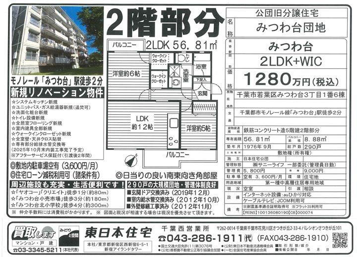 | お問い合わせ先 | 商号:東日本住宅(株)千葉西営業所 免許番号:国土交通大臣(11)第003076号 所在地:千葉県千葉市花見川区さつきが丘2-33-4 パレシオンさつきが丘101 TEL:043-286-1911 取引態様:専任媒介 管理コード:CB000074 | 共有する |