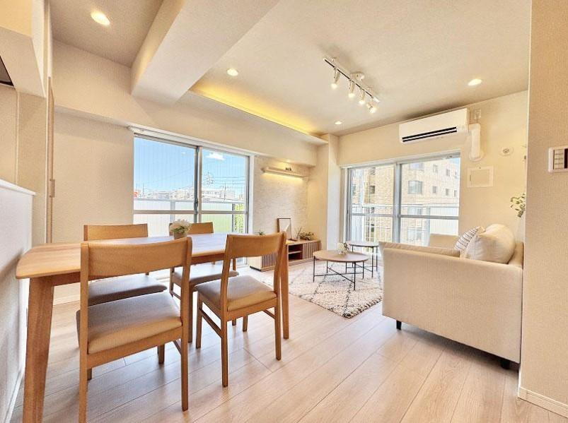 - リノベーション、3面採光、東南向き、角住戸、2面以上バルコニー、対面式キッチン、市街地が近い、内装リフォーム、システムキッチン、浴室乾燥機、陽当り良好、全居室収納、シャワー付洗面化粧台、南面バルコニー、フローリング張替、温水洗浄便座、TVモニタ付インターホン、都市近郊、通風良好、全居室フローリング、食器洗乾燥機、浄水器