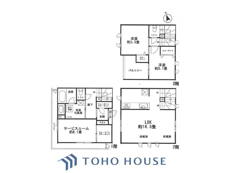 ウォークインクローゼット・システムキッチン・対面K・トイレ2ヶ所・床暖房・専用庭・宅配BOX・シューズインクローク |