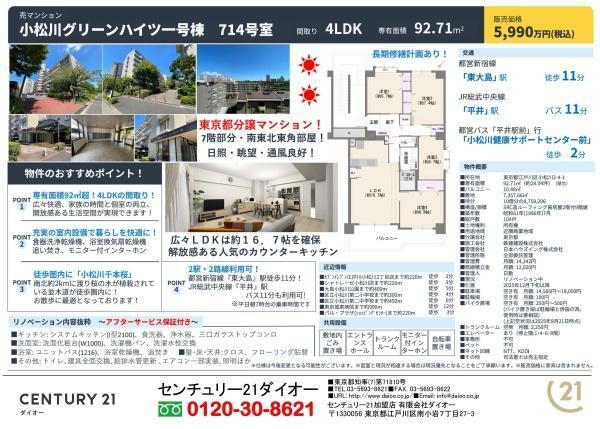 | 備考 | <物件名>小松川グリーンハイツ1号棟/<駐車場>敷地内/委託(日勤)/<土地権利>所有権/<間取り>4LDK/<リフォーム>●リフォーム:2025年12月完了予定(水回り設備交換:キッチン・浴室・トイレ、内装リフォーム:壁・床・全室、その他:ハウスクリーニング他)※年月は一番古いリフォーム箇所を表します/<特徴>新規リフォーム済で新築気分でご入居できます 7階部分の南東北東角部屋!、内装リフォーム・システムキッチン・浴室乾燥機・角住戸・陽当り良好 販売戸数:1戸/管理費等帯:14342円/修繕積立金帯:12020円 法令等制限:長期修繕計画有 エレベーター停止階:1・4・6・8階 共有持分:7357.66平米×8759206/1000000000有 ペット:不可 事務所:不可 |