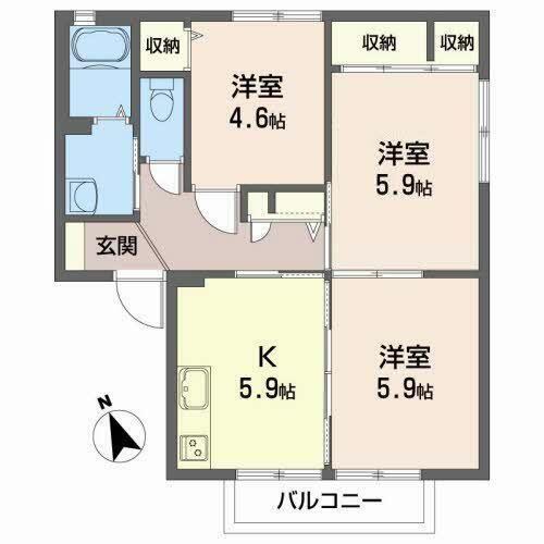 | 間取り | 3K(K5.9帖 洋室5.9帖 洋室4.6帖 洋室5.9帖) | 築年月(築年数) | 1998年3月(築27年10ヶ月) |
