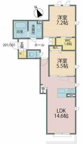 | 間取り | 2LDK(LDK14.6、洋7.2、洋5.5) | 築年月(築年数) | 2021年6月(築4年7ヶ月) |