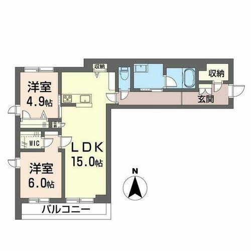 | 間取り | 2LDK(LDK15.0帖 洋室6.0帖 洋室4.9帖) | 築年月(築年数) | 2024年10月(築1年3ヶ月) |