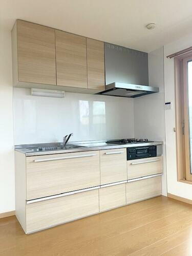 システムキッチン付です。また広々とした延床面積55.68㎡の居室空間で、その上深呼吸してリラックスできちゃうルーフバルコニー付なので、アウトドア家具のチョイスでカントリー風も南国風も思いのまま。ちなみに来客時には寝室や荷物の一時避難場所としても重宝するロフト付です。家族の安心拠点になる2LDK。百聞は一見にしかず。是非見学にお越しください。