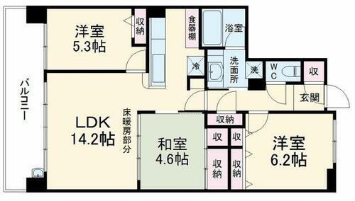 | 間取り | 3LDK(LDK14.2、洋5.3、6.2、和4.6) | 築年月(築年数) | 2014年2月(築11年11ヶ月) |