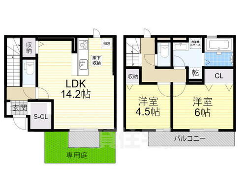 | 間取り | 2LDK(LDK 14.2/洋室 6/洋室 4.5) | 築年月(築年数) | 2025年9月 新築 |