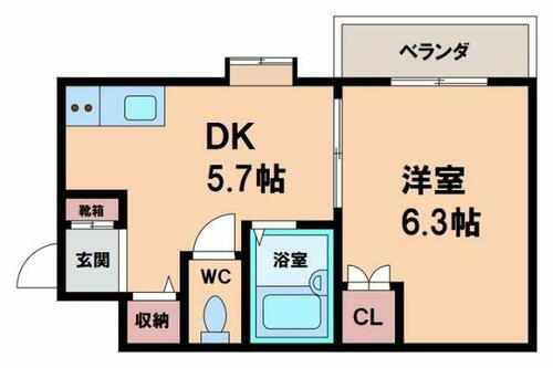 | 間取り | 1DK(DK5.7、洋6.3) | 築年月(築年数) | 1999年2月(築26年11ヶ月) |