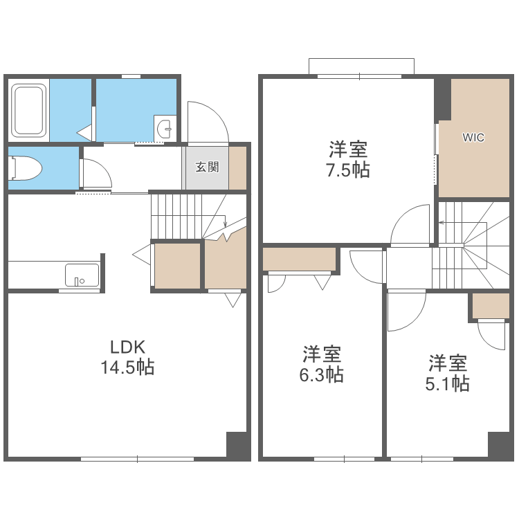 3LDK(洋7.5 洋6.3 洋5.1 LDK:14.5) |