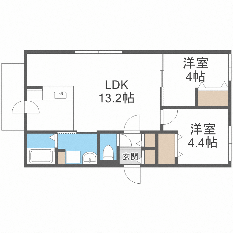 | 間取り | 2LDK(洋4.4 洋4 LDK13.2) | 築年月(築年数) | 2023年11月(築2年) |