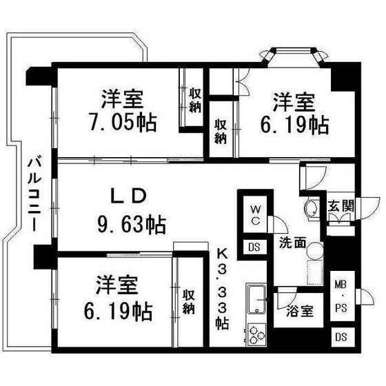 | 間取り | 3LDK(洋7.05 洋6.19 洋6.19 LD9.63K3.33) | 築年月(築年数) | 1977年11月(築48年2ヶ月) |