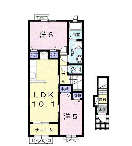 | 間取り | 2LDK(洋6 洋5 LDK10.1) | 築年月(築年数) | 2019年1月(築6年12ヶ月) |