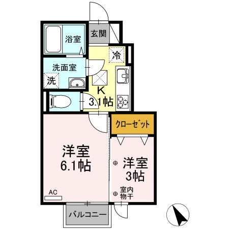 | 間取り | 2K(洋6.1 洋3 K3.1) | 築年月(築年数) | 2020年3月(築5年10ヶ月) |