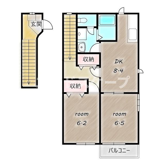 | 間取り | 2DK(洋6.5 洋6.2 DK8.4) | 築年月(築年数) | 2002年9月(築23年3ヶ月) |
