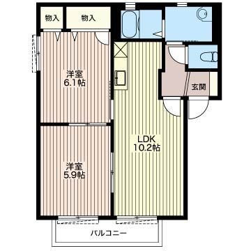 | 間取り | 2LDK(洋6.1 洋5.9 LDK10.2) | 築年月(築年数) | 2002年4月(築23年7ヶ月) |