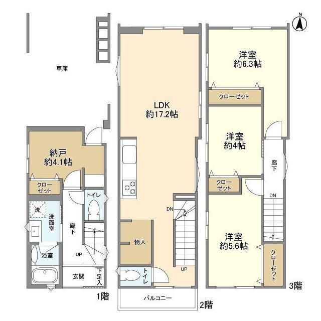 | 間取り | 3SLDK(洋6.30 洋5.60 洋4.00 LDK17.20 納戸 4.10) | 築年月(築年数) | 2023年9月(築2年4ヶ月) |