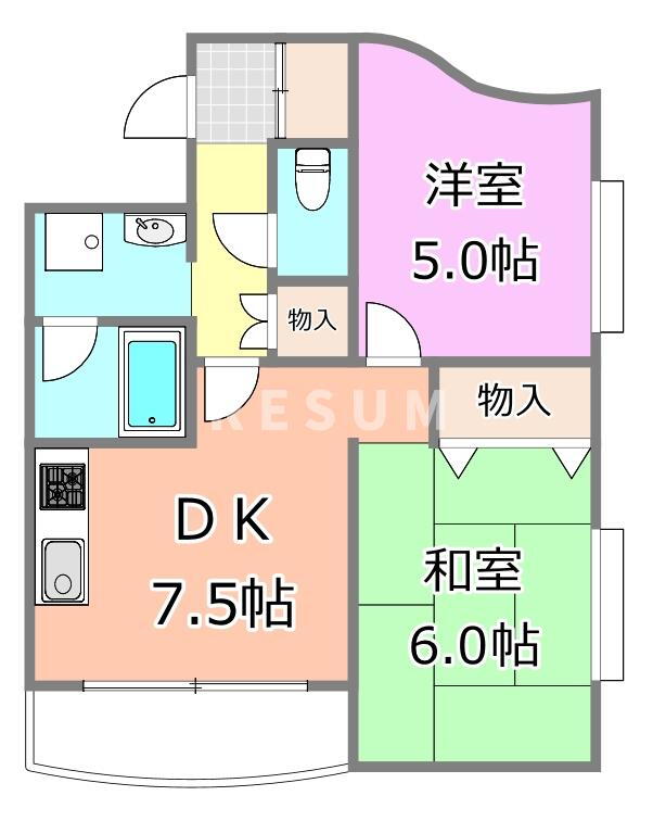 | 間取り | 2DK(和6.0 洋5.0 DK7.5) | 築年月(築年数) | 1988年5月(築37年7ヶ月) |