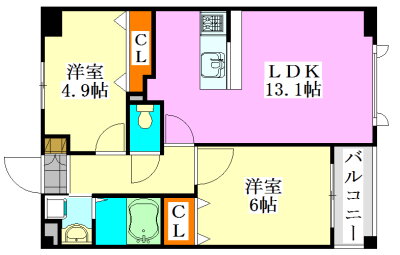 | 間取り | 2LDK(洋6.0 洋4.9 LDK13.1) | 築年月(築年数) | 2012年3月(築13年9ヶ月) |