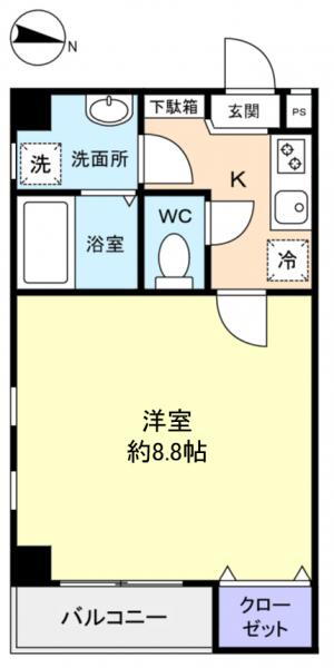 | 間取り | 1K(洋8.8 K1.5) | 築年月(築年数) | 2012年2月(築13年10ヶ月) |