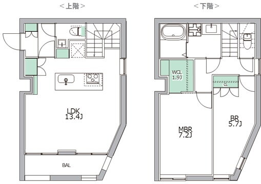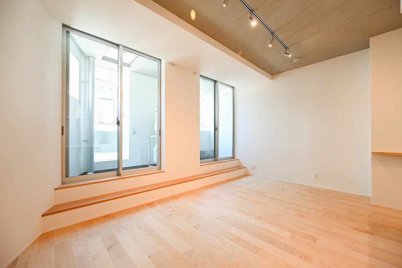 - 駅・商店街近隣の住環境良好、住みやすさを追求した住戸プラン。 上階は天井高2.73mの広々としたLDK。家族とのコミュニケーションを大事にしたアイランドキッチン。下階は折り上げ天井にして半地下であっても大きな開口部を設置。