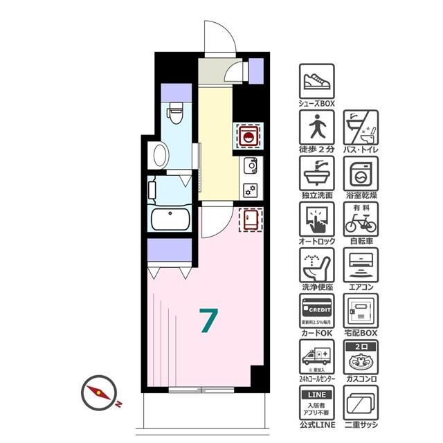 | 間取り | 1K(洋7.0) | 築年月(築年数) | 2015年6月(築10年7ヶ月) |
