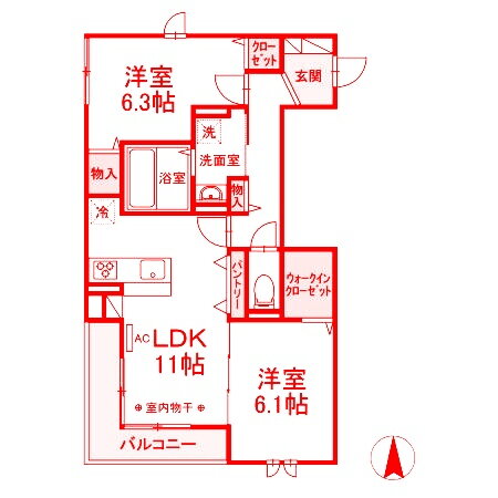 | 間取り | 2LDK(洋6.3 洋6.1 LDK11.0) | 築年月(築年数) | 2022年6月(築3年7ヶ月) |