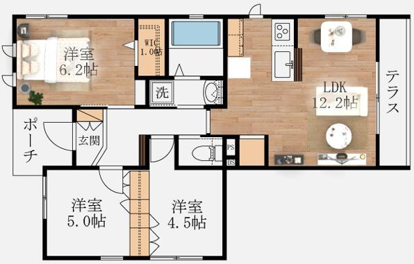 | 間取り | 3LDK(洋6.2 洋5.0 洋4.5 LDK12.2) | 築年月(築年数) | 2021年12月(築3年11ヶ月) |