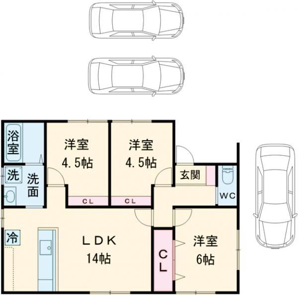 | 間取り | 3LDK(洋6.00 洋4.50 洋4.50 LDK14.00) | 築年月(築年数) | 2025年8月 新築 |