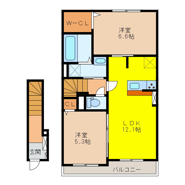 | 間取り | 2LDK(洋6.6 洋5.3 LDK12.1) | 築年月(築年数) | 2020年3月(築5年10ヶ月) |