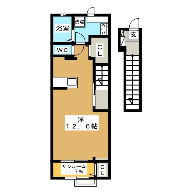 | 間取り | 1K(洋10.6 K1.9 サンルーム 1.7) | 築年月(築年数) | 2021年1月(築4年12ヶ月) |