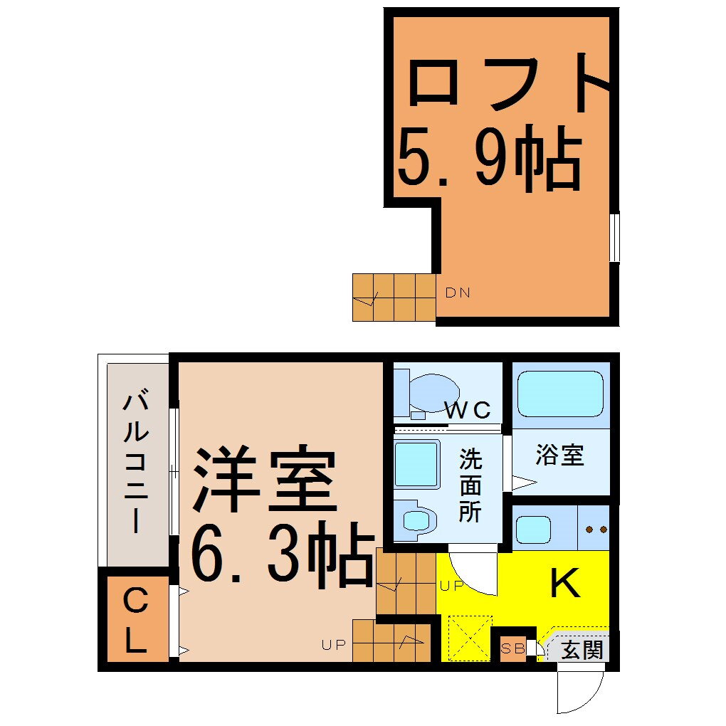 | 間取り | 1K(洋6.3 ロフト 5.9) | 築年月(築年数) | 2015年8月(築10年5ヶ月) |