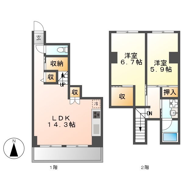 | 間取り | 2LDK(洋6.7 洋5.9 LDK14.3) | 築年月(築年数) | 2002年3月(築23年10ヶ月) |