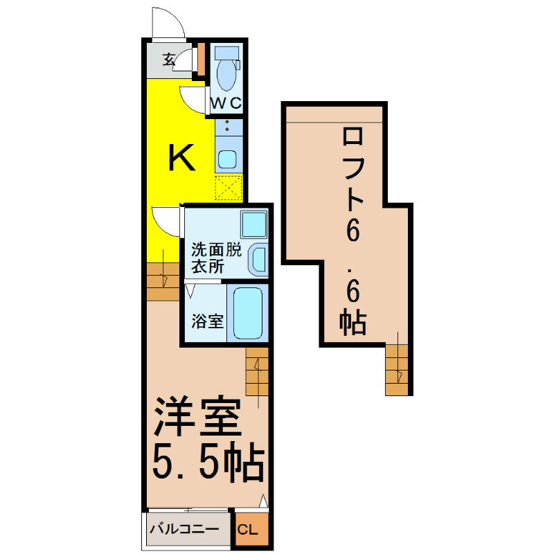 | 間取り | 1SK(洋5.5 ロフト 6.6) | 築年月(築年数) | 2016年3月(築9年8ヶ月) |