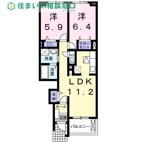 | 間取り | 2LDK(洋6.4 洋5.9 LDK11.2) | 築年月(築年数) | 2009年3月(築16年10ヶ月) |
