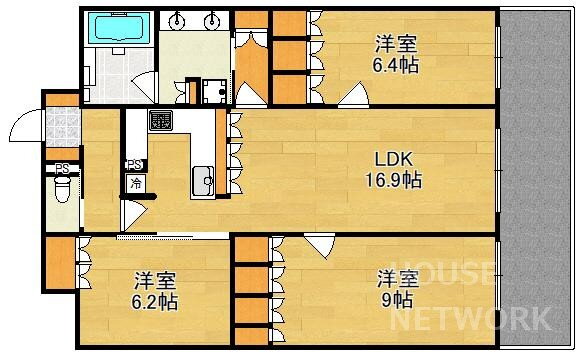 | 間取り | 3LDK(洋9 洋6.4 洋6.2 LDK16.9) | 築年月(築年数) | 2021年10月(築4年2ヶ月) |
